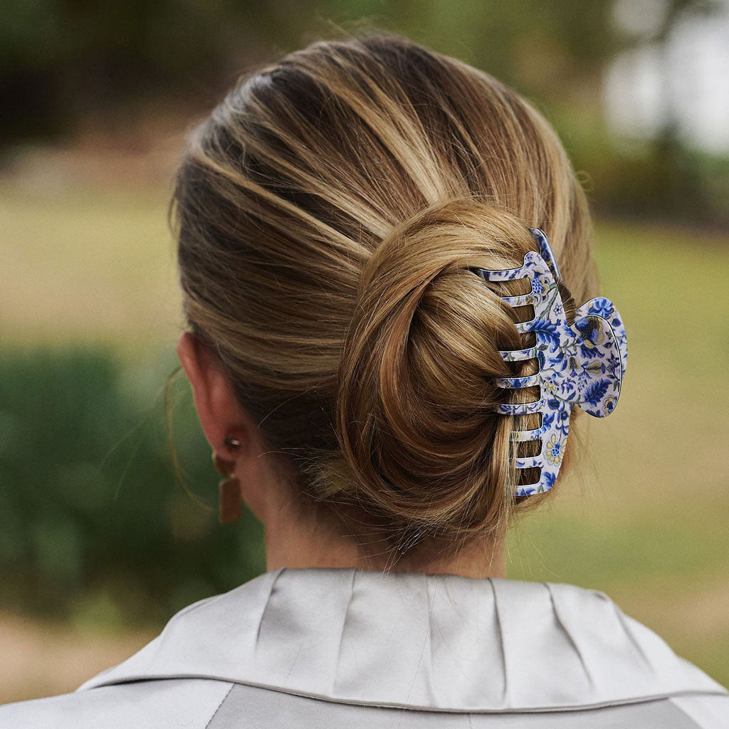 Secure your hair with our Verity Large Claw Clip. This stylish clip features a beautiful blue and white floral pattern inspired by classic botanical prints. It's perfect for creating a half-up hairstyle or a quick and easy up do.